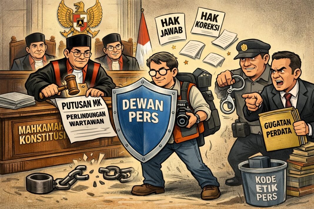 Jakarta, KarawangExpose.com – Mahkamah Konstitusi (MK) memutuskan wartawan tidak dapat langsung dituntut pidana atas karya jurnalistiknya. Putusan ini merupakan tanggapan MK dalam uji materiil terhadap Pasal 8 Undang-Undang Nomor 40 Tahun 1999 tentang Pers (UU Pers) yang diajukan Ikatan Wartawan Hukum (IWAKUM).